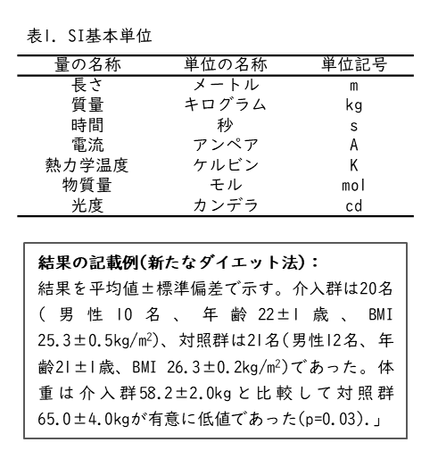 研究で得られた成果を記載します。注意が必要な点として、結果の項には客観的なデータのみを記すべきであり、結果の解釈は記載しないことです。表記する統計量(平均値、中央値、比率など)、対象の基本属性(人数、年齢や体格など)、統計学的検討の結果などです。統計量として平均値を用いる場合は平均値±標準偏差、中央値を用いる場合は中央値(25パーセンタイル、75パーセンタイル)であることを明示します。単位は国際単位系(SI単位)を用います(表1)。また、統計学的な言い回しとして、差の検定では「AはBよりも有意に低値/高値であった」などのように、どのような差があるのか明記しましょう。ときどきみかける「A群とB群の間に有意差があった」「A群はB群よりも低い傾向があった(p=0.11)」などは不適切な例になります。さらに、データ記載の原則として、「方法」の記載順に従って書く、古い既知のものから新しい未知のもの(今回の新規性)の順に書いていく。さらに全体的なことから順次項目を分けて詳細に記述することを推奨します。
